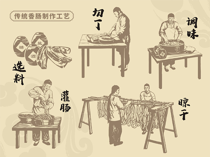 北魏·賈思勰《齊民要術(shù)》—灌腸法:“取羊盤腸,凈洗治。細(xì)銼羊肉,令如籠肉,細(xì)切蔥白、鹽、豉汁、姜、椒末調(diào)和,令咸淡適口,以灌腸。兩條夾而炙之。割食甚香美。”這是有據(jù)可查的最早關(guān)于香腸工藝的史料記載。