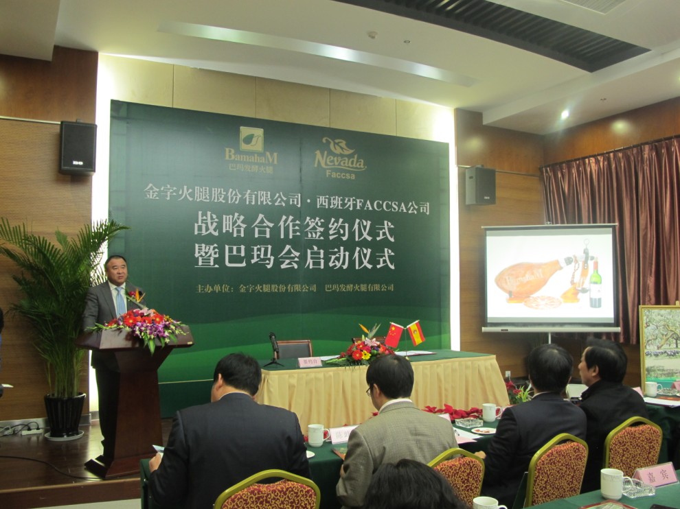 西班牙FACCSA公司負(fù)責(zé)人拉蒙先生在致辭中表示,發(fā)酵火腿在中國有巨大的市場空間,巴瑪火腿是中國發(fā)酵火腿的領(lǐng)軍品牌。雙方建立戰(zhàn)略合作關(guān)系,是企業(yè)發(fā)展需要,也是優(yōu)勢互補(bǔ)的最佳選擇。今后,雙方要整合資源,加強(qiáng)交流,深化合作,努力把兩個企業(yè)的合作打造成中西兩國經(jīng)貿(mào)合作的典范。