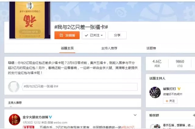 自前幾天支付寶將“集5福,搶2億+紅包”的活動規(guī)則公布后,一時間,有關(guān)??〒Q贈的話題強行霸屏。在有金字粉絲集齊了五福后,金字順勢在微博平臺上策劃的#我與2億只差一張???的微話題就引發(fā)了高達4.6億的閱讀量,網(wǎng)友們通過點贊評論及轉(zhuǎn)發(fā)分享的方式,第一時間表達了自己對于五福??ê痛和?億紅包的高度期待!