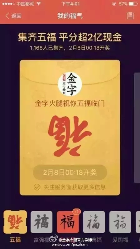 通過咻一咻為大家派現(xiàn)金紅包和???,不管你是缺和諧福、富強福、愛國福、友善福還是傳說中的敬業(yè)福,到時候都可以通過支付寶咻一咻獲得哦,平分2億+現(xiàn)金大獎。猴年春晚期間,大家不僅可以領(lǐng)到金字火腿發(fā)放的福卡,還可以領(lǐng)到金字的現(xiàn)金紅包哦!
